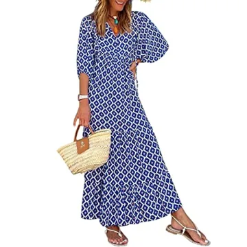 Miduo Womens Dresses Fashion Beach Casual Summer V Neck Half Sleeve Pattern Bohemian Style Maxi Long Floor Dresses S