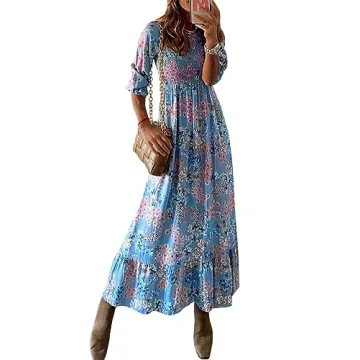 miduo Womens Fashion Smocked Crewneck Long Sleeve High Waist Flower Pattern Maxi Long Dresses Prom Garden Dresses XL