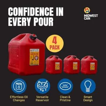 Show more The Midwest Can 5610 Safe-Flo Auto Shut Off Gas Can is a revolutionary solution designed for the safe and efficient storage of gasoline. Created from durable HDPE plastic, this 5-gallon gas can incorporates advanced barrier materials that significantly reduce hydrocarbon emissions, making it an eco-friendly choice for both short and long-term fuel storage.