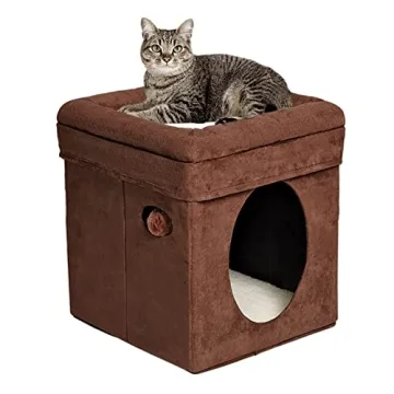 Show more Introducing the MidWest Homes for Pets 137-BR 'The Original' Curious Cat Cube, a stylish yet functional haven designed specifically for your beloved felines and small dogs. Crafted with a luxurious brown faux suede exterior paired with a soft synthetic sheepskin top, this cube serves as an inviting oasis where pets can curl up and relax comfortably. Measuring 15.5 inches in width and length and 16.5 inches high, it provides just the right amount of space for your furry friends to unwind while blending seamlessly with your home decor.