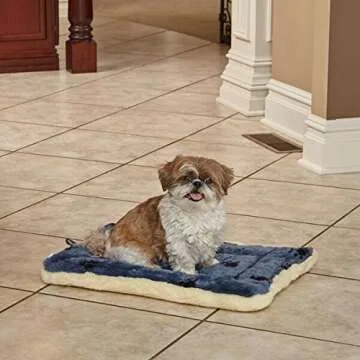 Show more The cozy enclave for your beloved pet is here! Introducing our Comfortable Reversible Pet Bed, an ideal resting place that promises ultimate softness and warmth for your furry friend. This exquisitely designed pet bed features a distinctive blue and cream paw print pattern that's not only adorable but also a stylish addition to your home decor. Measuring 17 inches long, 11 inches wide, and 1.5 inches high, it's perfect for fitting into standard 18-inch dog crates while providing a comfortable haven for tiny breed dogs and cats weighing up to 6 lbs.