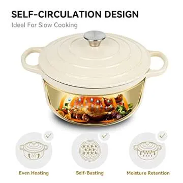 Crafted with a unique enclosed thermal circle design that features a circulating shower-type lid, this Dutch oven guarantees your meals stay moist and packed with nutrition. Its impressive heat tolerance of up to 500°F caters to various cooking methods on gas, electric, ceramic, and induction stovetops, making it a truly adaptable kitchen tool. The vibrant enameled finish not only adds a pop of color to your kitchen but also makes cleaning a breeze—soaking and wiping will often suffice for spotless maintenance.