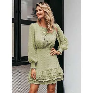 Show moreStep into elegance and comfort with the Miessial Women's Fall Long Sleeve Chiffon Lace Mini Dress, a perfect addition to your wardrobe for spring, summer, and fall. Crafted from 100% polyester chiffon, this lightweight and soft dress features long lantern sleeves and a chic crew neck, enhancing your style while ensuring all-day comfort. The elastic waist offers a flattering fit with an A-line silouette, beautifully draping to emphasize your figure. With its exquisite ruffle design, this cute fall mini dress promises to make you feel more beautiful and lovely, whether you’re out on casual outings or attending special events.