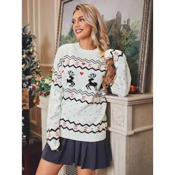 Miessial Women's Ugly Christmas Knitted Sweater Funny Cute Reindeer Snowflake Pulover Crew Neck Sweatshirt for Holiday White M