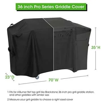 Show moreIntroducing the Mightify Griddle Cover—the ultimate protection for your outdoor grilling investment. Specifically designed for 36-inch flat top grills, this heavy-duty cover measures a generous 70 inches wide, 23 inches deep, and 35 inches high. Made with a specialized fabric that features a waterproof vinyl lining and tape-sealed seams, this cover ensures that no water escapes, keeping your grill safe from rain, snow, and other moisture. The cover’s durability is compounded by its fade and tear-resistant material, making it a reliable choice to withstand the elements and irregular wear.