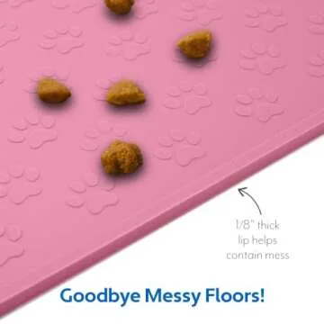 Show more Introducing the ultimate solution for keeping your floors pristine – the premium silicone dog food mat. Designed specifically for pet owners who value cleanliness and functionality, this mat features a 1/8 inch thick raised edge that effortlessly contains food and liquid spills. No more worries about messy floors! Crafted from 100% waterproof material, this mat protects your floors from leaks, ensuring everything stays dry and clean. You can easily clean it in the dishwasher, making maintenance a breeze.