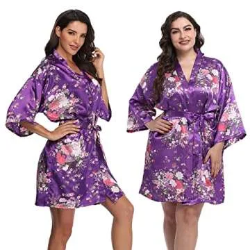 Mignon Cromwell Women's Floral Bride Bridesmaids Robe Satin Wedding Kimono Bridal Dressing Gown Sleepwear, Deep purple, M