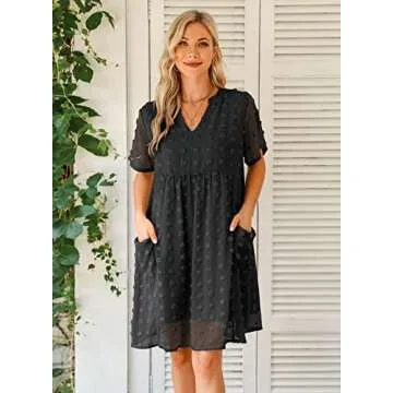 MIHOLL Womens Mini Dress V Neck Short Sleeve Ruffle Loose 2025 Summer Casual Flowy Dresses with Pockets(Black,Medium)