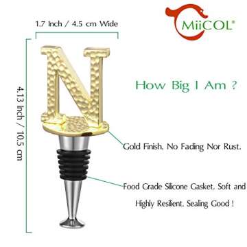 Show moreIntroducing the Miicol Prosecco Stopper, a charming and functional accessory that elevates your wine drinking experience. Crafted from durable die-cast metal and featuring a food-grade silicone gasket, this wine stopper is designed to provide a safe, effective seal. The elegant gold plating not only adds a touch of luxury but also resists fading and rusting, ensuring that your investment maintains its stunning appearance for years to come. With personalized initials, it becomes more than just a bottle sealer; it's a statement piece that adds a pop of color and style to any table setting.