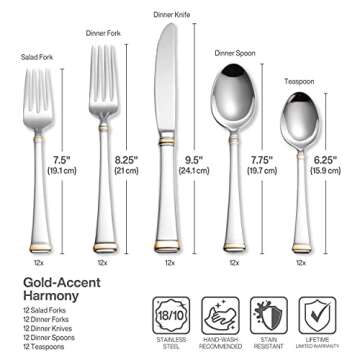 Mikasa, Gold Accent Harmony Flatware Service for 12, 65 Piece Set, 18/10 Stainless Steel, Silverware Set with Serving Utensils