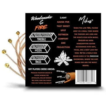 Show more Awaken your musical creativity with the MIKESR Woodsmoke & Fire Series Acoustic Guitar Strings. This premium quality set features light gauge strings (0.012-0.053) crafted from top-notch phosphor bronze material, ensuring a brilliant sound that lasts. Designed for enhanced playability, these strings transform your guitar into a resonant powerhouse. The hexagonal core construction guarantees superior tuning stability and maintains consistent tension, giving you peace of mind during those intense jam sessions.