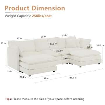 mikibama Modular Sectional Sofa, 111.5 Inch U Shaped Couch Set for Living Room, 3-Seater Comfy Cloud Couches with Movable Ottoman, DIY Combination, Chenille, Beige