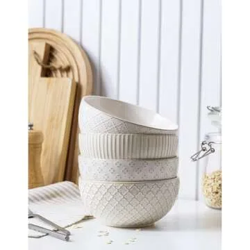 MIKIGEY Ceramic Soup Bowls 30 OZ, Cereal Bowls Set of 4 for Kitchen, Stoneware Bowls with Embossment, Farmhouse Vintage Bowls for Cereal, Soup, Rice, Salad, Fruits, Arctic White