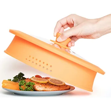 The innovative design features a sleek knob handle, allowing you to easily remove the cover without the worry of burns. It is tall enough to ensure that it won't touch your food, meaning your culinary creations stay intact and protected during cooking. Plus, the silicone rim provides a secure fit, helping to keep your microwave clean from splatters while cooking.