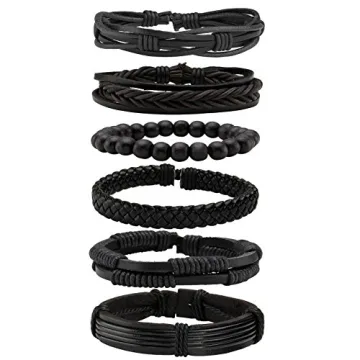 MILAKOO 6 Pcs Black Braided Leather Bracelets for Men and Women