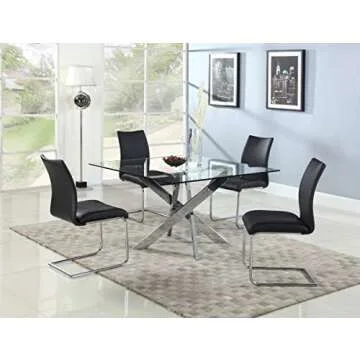 Show moreIntroducing the Milan Petra Clear/Chrome Jax-Style Square Glass Dining Table, a stunning centerpiece designed to redefine your dining experience. Combining contemporary style with functionality, this dining table boasts a sleek, crystal-clear glass top that equally showcases its surroundings while providing ample space for meals and gatherings. Measuring a generous 48" x 48" square, it accommodates family dinners and friendly get-togethers alike. The chrome jax-style legs offer robust support while adding a touch of modern elegance, enhancing the table's aesthetic appeal. Perfect for both formal dining rooms and casual kitchen spaces, this table is designed to impress.