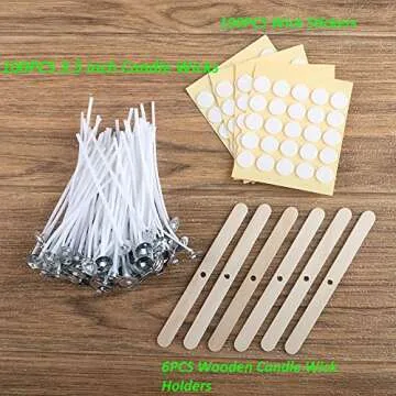 Show more Unleash your creativity with our exceptional candle-making bundle! This set contains 100 low smoke candle wicks perfectly designed for containers with a diameter of less than 3.0 inches, allowing you to create beautiful, aromatic candles right at home. Included in the package are 100 candle wick stickers and 6 candle wick centering devices to ensure you'll have everything you need for a successful DIY project.