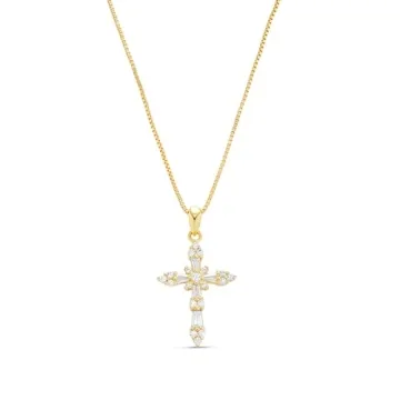 The necklace is crafted with high-quality 14K gold plating and features CZ stones in its cross pendant.