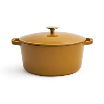 Show more Discover the perfect blend of functionality and style with the Milo by Kana 5.5-quart Enameled Cast Iron Dutch Oven. Crafted from premium materials, this stunning cookware not only beautifies your kitchen but also delivers exceptional performance for all your culinary adventures. Designed for both amateur cooks and seasoned chefs alike, its French-inspired design ensures that you can explore a variety of cooking methods confidently—from slow-cooking stews and tossing sumptuous casseroles to baking artisan bread in your very own home. The beautiful Dijon color complemented with an elegant gold knob enhances its appeal, making it a statement piece as well as a practical tool.