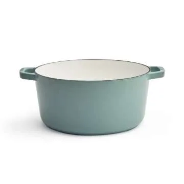 Show moreIntroducing the Milo by Kana 5.5-quart Enameled Cast Iron Dutch Oven, the perfect blend of durability, functionality, and timeless design. This luxurious cookware is crafted from premium materials, incorporating 40% recycled iron, allowing it to make a statement in both your kitchen and the environment. With a striking Eucalyptus color adorned with a sophisticated gold knob, this Dutch oven isn’t just a cooking vessel; it's a centerpiece for your culinary creations. The Milo Dutch oven features a superior ground coating that ensures optimal adherence of its double layers of Belgian porcelain enamel, providing exceptional non-stick performance.