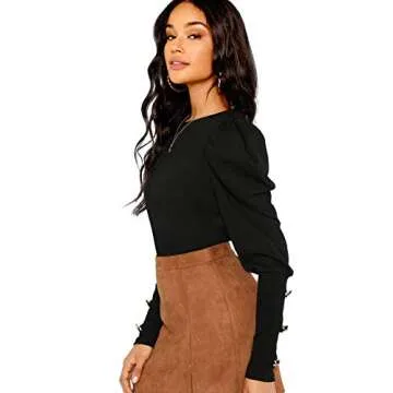 Milumia Women Puff Sleeve Tops Round Neck Long Sleeve Tee Shirts Black X-Small