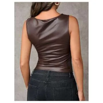 Feature: Sleeveless, Crew Neck, Ruched, Solid, Slim Fit, Leather Tank Tops for Women
