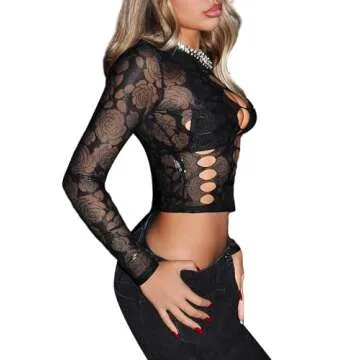 Milumia Women's Y2k Cut Out Floral Mesh Long Sleeve Sheer Crop Tee Sexy Rave Party Tops Black Large