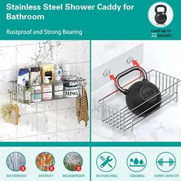 Show more This 2 Pack Bathroom Shower Caddy is an essential tool for anyone looking to enhance their bathroom organization. Designed with both functionality and style in mind, these shower organizers come in two different stylish designs, making them an attractive addition to any shower area. The clever deep basket construction allows for a surprisingly large capacity, accommodating your shampoo, conditioner, and more without the fear of items tipping over or falling during use. With each caddy boasting the strength to hold up to 22lbs, you can rest assured that your essentials are safely stored. Built from high-quality SUS304 stainless steel, these caddies are not only durable but also resistant to rust and corrosion, ensuring a long-lasting solution to your shower storage needs.