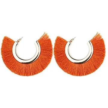 Mina Bohemian Statement Boho Tassel C Shape Fringe 3 Inch Drop Updated Ethnic Warrior Hoop Orange Earrings