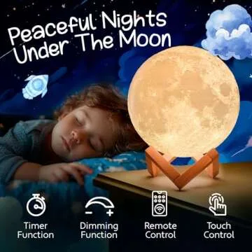 Show more Delve into the magical world of our stunning 3D-printed moon lamp, designed to create a soothing celestial ambiance right in your own home. This exquisite lamp captures the beauty of the moon with impeccable detail, allowing you to transform any space into a serene night sky. Featuring a range of 16 vibrant colors to choose from, it ignites creativity in children aged 4-10 while offering a gentle light that helps them drift off to peaceful slumber. Its innovative Remote & Touch Control makes it easy to adjust brightness and shift through colors, ensuring the perfect atmosphere for any moment.