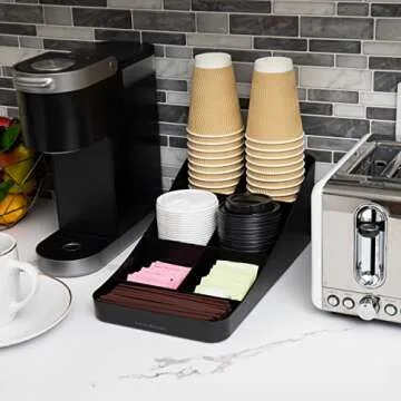 Show moreThe Mind Reader Cup and Condiment Station is more than just an organizer; it's a stylish functional display that revolutionizes the way you manage your coffee essentials and condiments. With a thoughtful design that balances lightweight durability and a sophisticated aesthetic, this countertop organizer is perfect for home or office. Featuring seven compartments that easily accommodate coffee pods, creamers, cups, tea bags, and even day-to-day essentials like ketchup and mayonnaise, this product shines in versatility. Measuring a convenient 15.5 inches deep by 7.25 inches wide by 5.25 inches tall, it effortlessly fits into compact spaces, ensuring that your coffee bar remains clutter-free yet accessible.