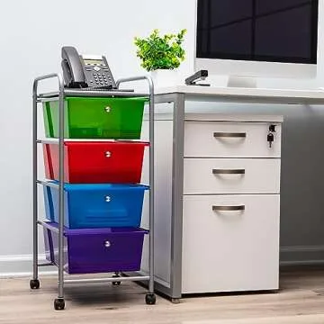 Show moreDiscover unparalleled organization with the Mind Reader Rolling Cart with Drawers, a versatile storage solution that adapts to your dynamic lifestyle. This utility cart is crafted to handle a multitude of items, from office supplies and kitchen essentials to makeup and toiletries, effortlessly merging functionality with style. Its compact dimensions of 12.75 inches long x 15.25 inches wide x 30 inches tall allow it to seamlessly fit into any corner of your home or workspace, while its vibrant multi-color drawers and sleek silver frame bring an exhilarating burst of color to any decor.