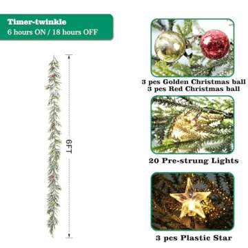 Bring the magic of the festive season into your home with the MINDELF 6 FT Artificial Christmas Garland. This stunning faux spruce evergreen garland stands out with its lifelike branches and a realistic design that effortlessly enhances your holiday decor without wilting or hassle. The garland is adorned with enchanting 20 warm LED lights that can beautifully illuminate your space, creating a cozy and inviting atmosphere. Additionally, the distinctive golden powder on the...