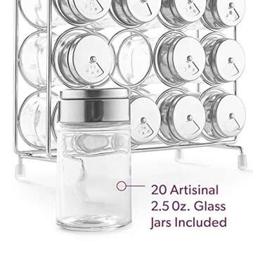 Crafted from extra-sturdy, rust-resistant stainless steel, our spice organizer boasts a sleek, minimal chrome finish that seamlessly fits into any kitchen decor. No more cluttered cabinets—display your spices with pride! This set includes 20 BPA-free glass jars, each with a generous size of 2 oz, perfect for holding a variety of herbs and spices.