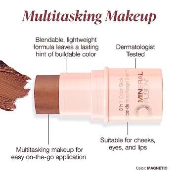 Show more Discover the transformative power of the Mineral Fusion 3-in-1 Color Stick, an essential addition to your beauty collection that redefines convenience. This innovative product effortlessly combines three functions into one charming twist tube, serving as a lip tint, cheek tint, and eyelid color pop. Perfect for those busy mornings or last-minute touch-ups, it seamlessly suits various skin tones with its creamy, lightweight texture.