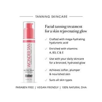 Show more Introducing the MineTan Gradual Tinted Moisturizer For Face, your new go-to for achieving a sun-kissed glow without the commitment of a traditional self-tanner. This innovative Wonder Tan Bronzing Facial Serum combines the best of hydration and bronzing, delivering a luminous, natural-looking tan while pampering your skin. Enriched with mega-hydrating hyaluronic acid, it offers deep moisturization and promotes youthful skin health. Say goodbye to the days of orange undertones and unpleasant tanning smells; this product is specifically designed for the face, ensuring a flawless finish suitable for all skin types.