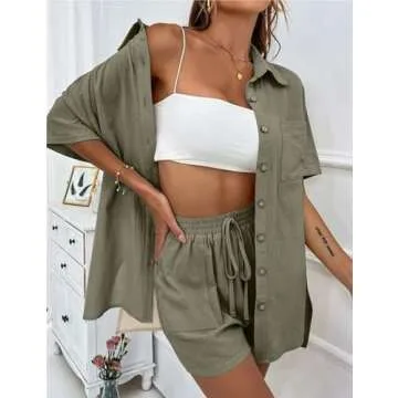 Mingzhu Women's Summer Linen 2 Piece Shorts Set Short Sleeve Shirts Beach Vacation Shorts Lounge Tracksuit