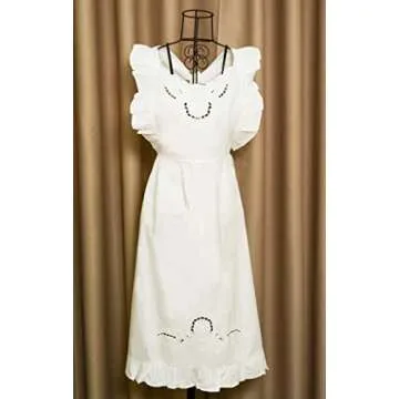 Minhcraft White Cotton Beautiful Flower Embroidery Apron-Ruffles Full Length Bib Women Apron