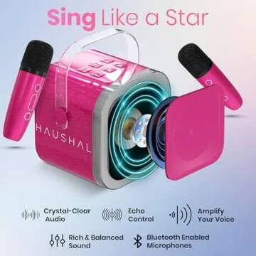 Show moreIntroducing the Mini Karaoke Machine with 2 Wireless Microphones, a perfect blend of fun and functionality designed for both kids and adults! Encased in a dazzling dark pink glittery finish, this compact karaoke machine not only catches the eye with its stylish aesthetics but also packs a punch in performance. Despite its small size, it delivers clear, high-quality HD stereo sound, ensuring every note and vocal shines bright during your karaoke sessions. Whether you're hosting a party or enjoying a quiet night in, the ease of use with Bluetooth V5.3 technology guarantees instant pairing, allowing you to simply turn the machine on and start singing without any hassles.