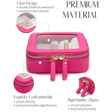 Show more The Mini Makeup Bag Clear Small Travel Cosmetic Case is your ultimate companion in achieving style and practicality in one chic package. Made from high-quality saffiano faux leather, this hot pink pouch radiates an air of luxury while standing up to daily wear and tear. Its elegant design is not just eye-catching; it was thoughtfully crafted to suit all your on-the-go needs. With a dimensions of 5'' x 4.7'' x 2'', this compact yet surprisingly spacious bag is tailored for everything from makeup to essential toiletries, keeping them organized and easily accessible.