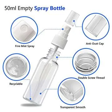 Introducing our Mini Spray Bottles, an essential addition to your travel accessories! These 2oz (50ml) spritzers are crafted from premium clear plastic, ensuring durability and sustainability. Designed for convenience, they're not only refillable but also reusable, allowing you to carry your favorite liquids anywhere without waste. The sophisticated spray nozzle delivers an even, fine mist, perfect for a variety of uses—from spritzing your face with refreshing water to dispensing hand sanitizer...
