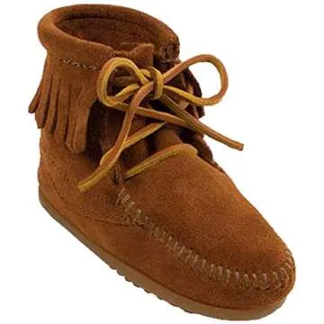 Show moreStep into style and comfort with the Minnetonka Ankle Hi Tramper Boot! Crafted with love, this ankle-high moccasin boot is designed to bring both functionality and flair to every child's wardrobe. Featuring a chic fringe topline and a delightful whipstitched toe, these boots are the perfect blend of traditional craftsmanship and modern aesthetics. The cushioned collar provides added comfort, ensuring that little feet are snug and cozy all day long while the durable grippy nub outsole guarantees stability and traction on various terrains, making playtime safe and fun.