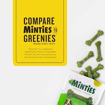 Don't compromise when it comes to your dog's health! With the Minties Dental Chews, you are choosing not just flavor but a genuine commitment to enhancing your pet's life. Join countless satisfied pet owners who have made the switch to Minties, and enjoy watching your dog's teeth sparkle and their breath stay fresh with each delicious chew!