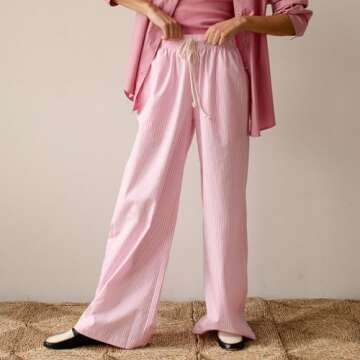 Miqil Women Y2K Striped Pants Loose Wide Leg Pinstripe Print Pants Casual High Waist Drawstring Lounge Pants Streetwear (A Pink, M)