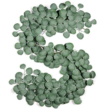 Show more Transform your celebrations with our stunning eucalyptus garland, designed to elevate any decor with its lush and vibrant presence. This beautiful garland comes packed with over 60 branches and 240 individual silk leaves, each measuring approximately 2.2 inches, ensuring a full and abundant look that brings life to your spaces.