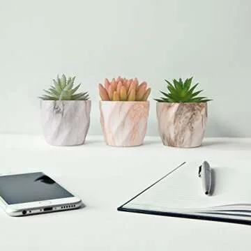 Show more Transform your plant collection with the exquisite Miracliy Succulent Pots. This elegant set of six miniature ceramic planters, each measuring 2.75 inches in diameter, showcases a beautifully glazed marbling design that radiates modern sophistication. Crafted from high-quality clay and fired at high temperatures, these pots feature a remarkable blend of style and durability, fitting seamlessly into your home decor and allowing your greens to thrive. Perfectly sized for short, squat succulents and cacti, these pots provide just the right blend of aesthetics and functionality, ensuring your plants not only grow beautifully but also stand out in any space.