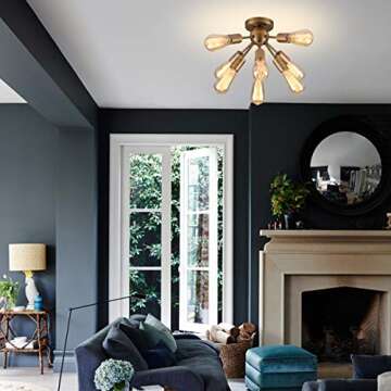 Show more Introducing the Mirrea Mid-Century Semi-Flush Mount Sputnik Ceiling Light—a stunning focal point for any room that artfully blends vintage charm with modern design. Perfectly suited for foyers, entryways, hallways, kitchens, dining rooms, and small bedrooms, this ceiling light boasts a beautiful brushed brass metal fixture that radiates elegance while offering a warm and inviting ambiance. With eight lights, it provides ample illumination and can easily transform your space into a stylish sanctuary.