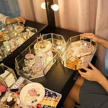 Mirror Gold Rectangle Makeup Decorative Tray, Metal Jewelry Organizer for Vanity, Bathroom, Dressing Table (Large)