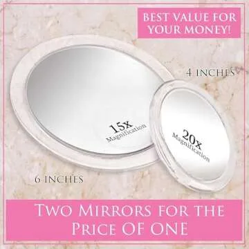 Show more Introducing the ultimate solution for precision and clarity in your daily grooming routine, our magnifying mirror set is a must-have for anyone looking to elevate their makeup application. This fantastic set comes with two expertly crafted mirrors: a 6” wide mirror featuring an incredible 15X magnification and a compact 3.8” wide mirror offering 20X magnification. Whether you're at home or on the go, these mirrors ensure that you always look your best with unrivaled detail and sharpness.