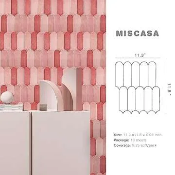 Miscasa Pink Peel and Stick Backsplash Tile, Self-Adhesive 3D Glossy Pink Tiles with Peacock Feather Design for Kitchen, Bathroom, and Cabinet Furniture, Waterproof and Removable Wall Tiles